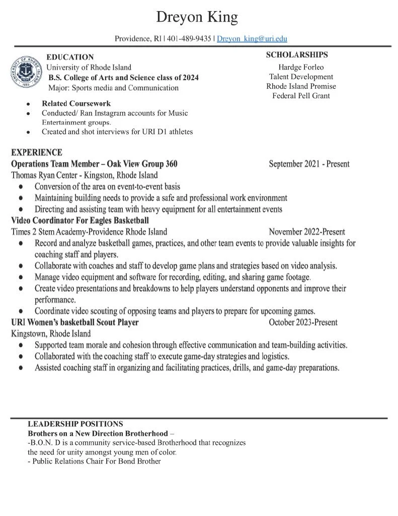 I am a dedicated sports media and communication professional, graduating from the University of Rhode Island in 2024. My experience as a Video Coordinator for Eagles Basketball and a Scout Player for URI Women’s Basketball has allowed me to develop skills in video analysis, strategy development, and team support. In my role with Oak View Group 360, I’ve gained expertise in event operations and logistics, ensuring professional and safe environments for entertainment events. Additionally, I serve as the Public Relations Chair for Brothers on a New Direction Brotherhood, a community service-based organization that fosters unity among young men of color. Backed by scholarships and a strong academic foundation, I bring strong communication, collaboration, and technical skills, positioning me as a valuable asset in sports media and team operations.